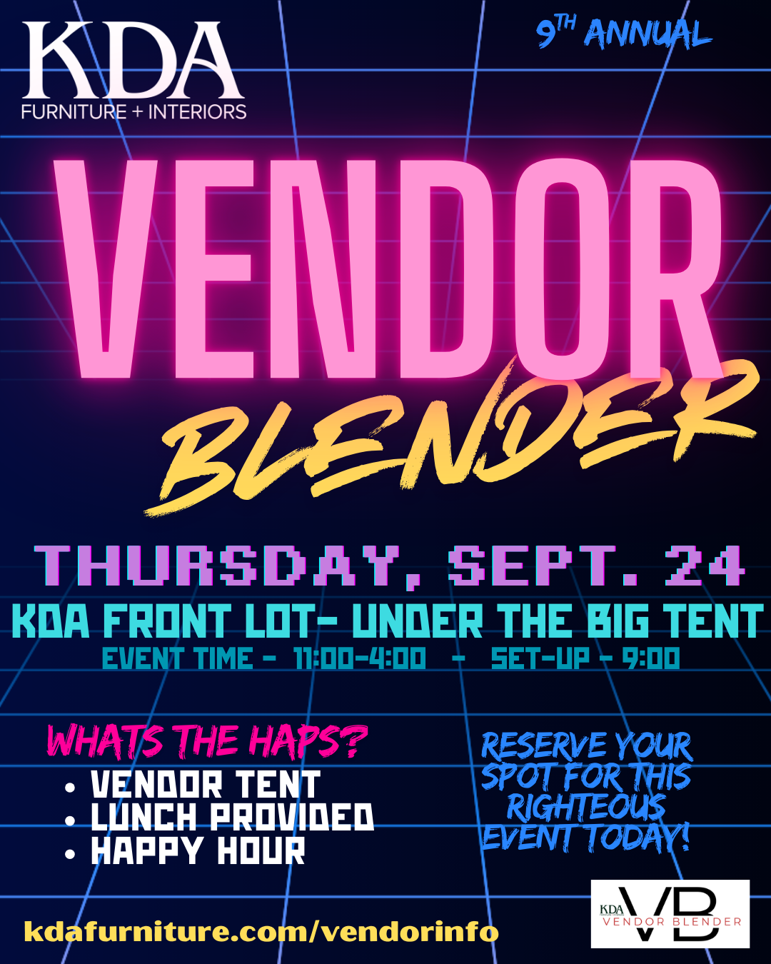 This year we are flashing back to the past! Choose your favorite decade and be ready to show your spirit at our 9th annual bodacious Vendor Blender Bash! Be it 50s, 60s, 70s, 80s, you name it! Dress up and/or decorate your booth to show your spirit for this event!